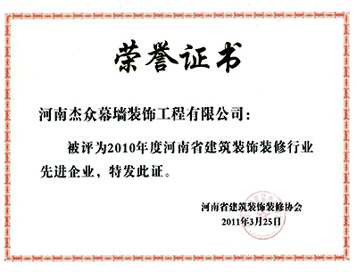 2010年先进企业证书